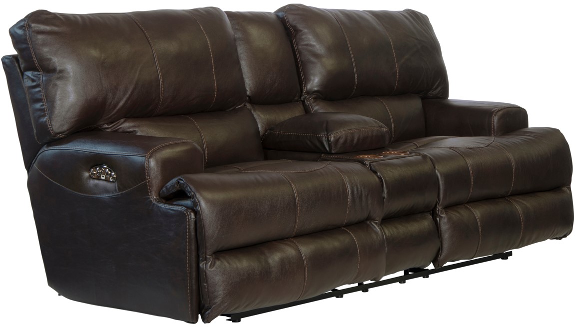 The Wembley Chocolate Power Headrest Power Lay Flat Reclining Console Loveseat features Lay Flat reclining comfort with decorative luggage stitching and power options. The top grain Italian leather/match paired with the Comfort Coil Seating featuring Comfor-Gel create an extremely comfortable seat.Read More