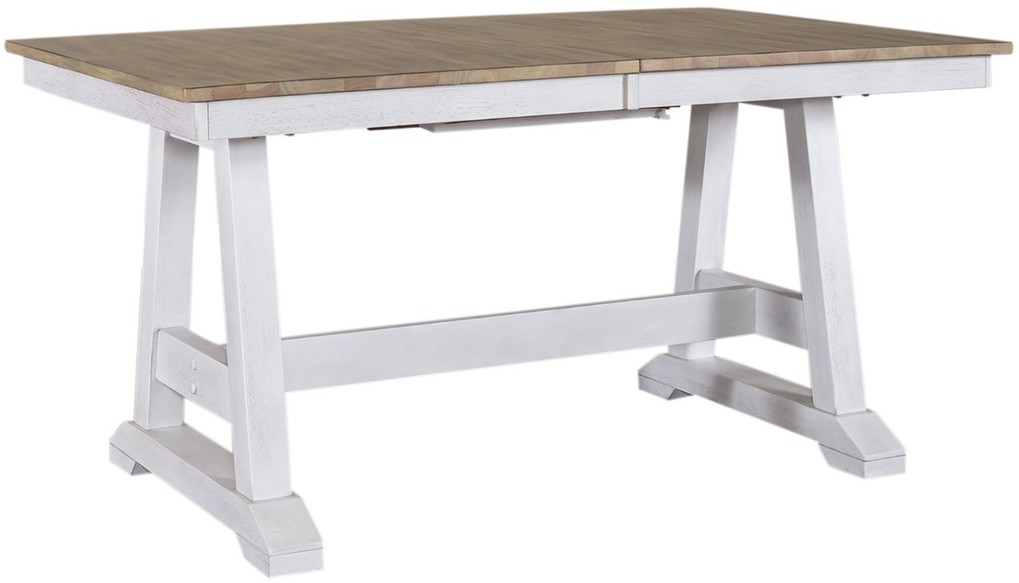 Wow family and friends with the Lindsey Farm trestle table. Crafted of rubberwood solids and veneers, this set features a weathered white and sandstone finish. The trestle table features an 18” self-storing butterfly leaf on an easy glide track system for easy opening and is anchored by splayed bracket feet with a center trestle.Read More