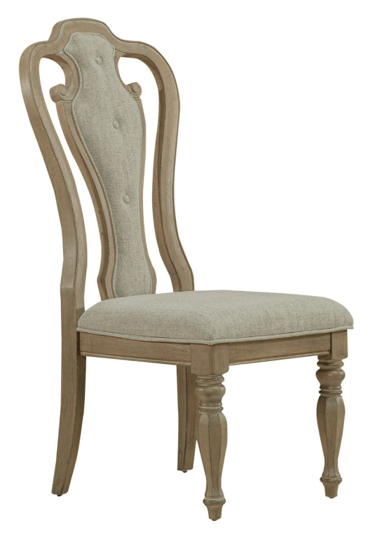 Sit and relax with the Magnolia Manor II splat back upholstered side chair. Crafted with excellence using Poplar solids, this chair features a Weathered Bisque finish. The chair offers a beautifully shaped arched cap rail and dog bone accents.Read More