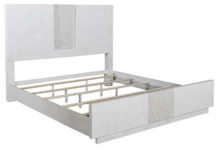 Light up your room using the Mirage panel bed. Crafted with rubberwood solids and quartered white oak veneers, the white finish is accented by wire brushing and a floating center faux travertine insert on the headboard and footboard, adding a modern flair.Read More
