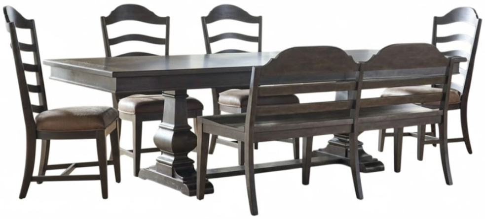Forget dining out and make your home the best place to enjoy a meal with the Paradise Valley six piece trestle table set. This set features a saddle brown finish and includes the trestle table, four upholstered ladder back side chairs, and the ladder back bench.Read More