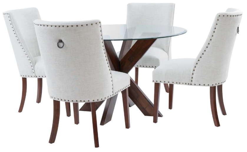 Invite new energy and excitement into your dining space with this contemporary 5 piece set. The table features a round beveled glass top placed over an industrial crisscross base made of solid acacia wood. The rich espresso or natural tones allow traces of the woodgrain to peer through.Read More
