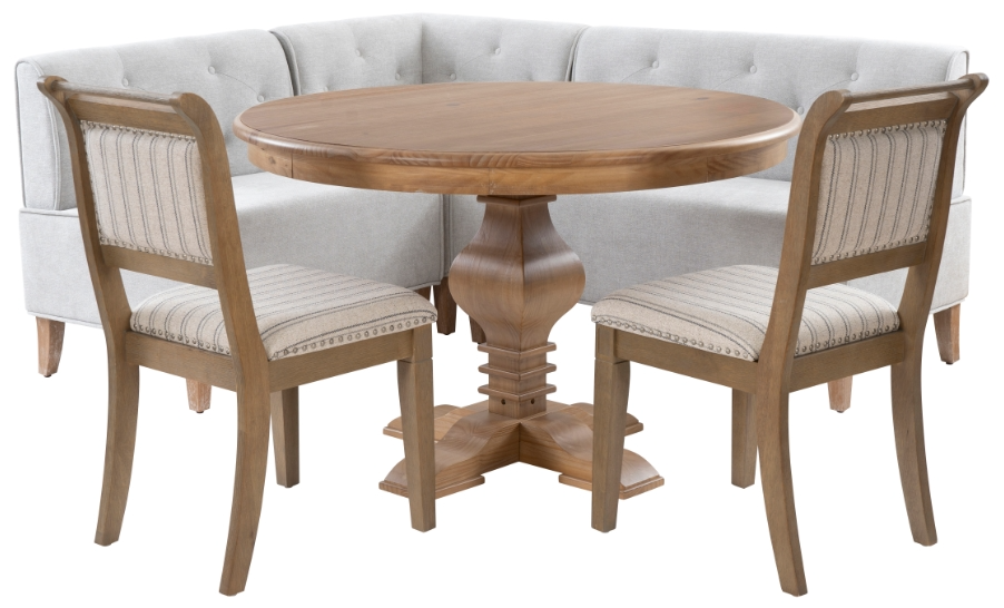 Complete 4-Piece Dining Set: Includes a three-piece corner bench, round pedestal dining table, and two upholstered dining chairs.