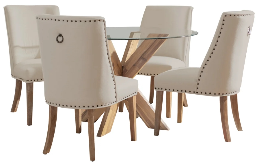 Invite new energy and excitement into your dining space with this contemporary 5 piece set. The table features a round beveled glass top placed over an industrial crisscross base made of solid acacia wood. The rich espresso or natural tones allow traces of the woodgrain to peer through.Read More
