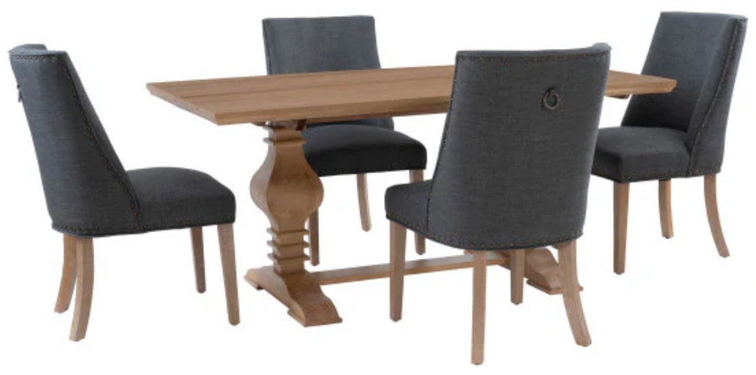 Elevate your dining space with our elegant 5-piece dining set. The table, crafted from solid pine wood in a rustic honey finish with a double pedestal design, exudes timeless charm. Each of the four solid wood chairs features a gray or natural finish and is upholstered in luxurious linen weave fabric.Read More