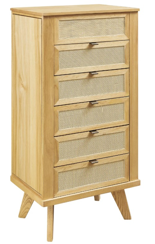 Meet the jewelry armoire that balances timeless style with everyday function. Available in sleek black or warm natural finishes, each piece is crafted from durable MDF and Baichun wood and accented with a charming cane inlay for a modern yet organic touch.Read More