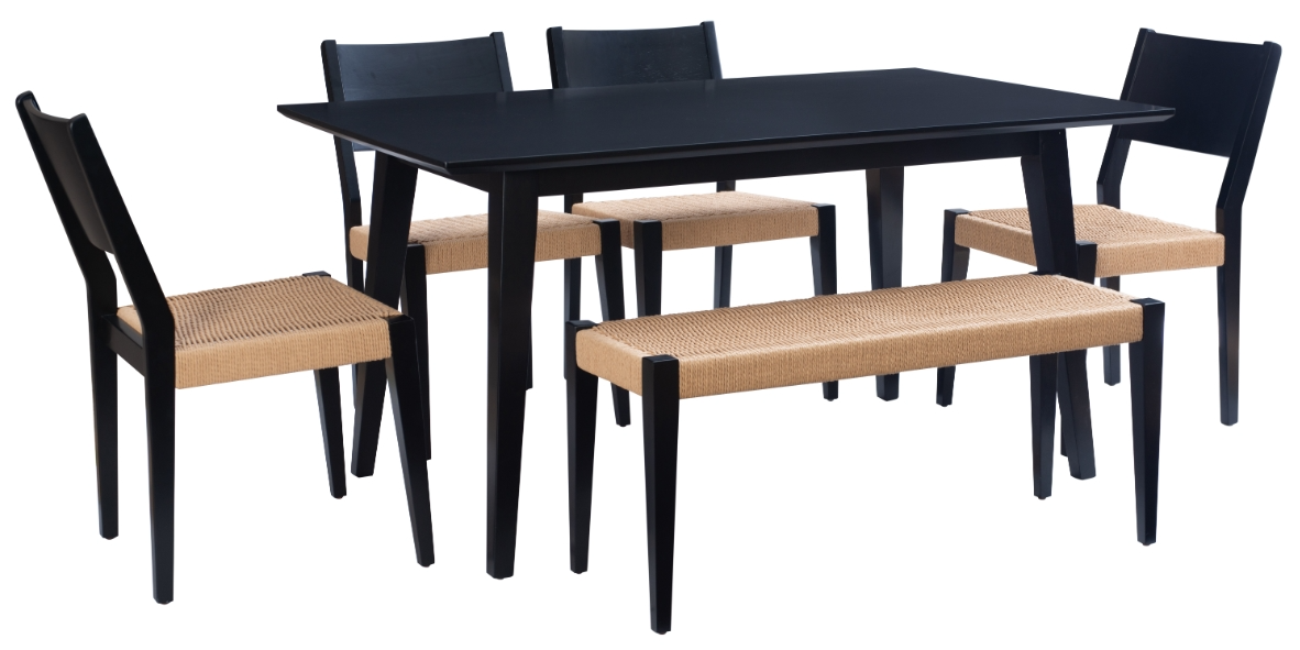 Transform family gatherings with this elegant mid-century modern dining set, designed to be the heart of your home. Clean lines and sleek silhouettes pay homage to classic design, while woven rope seats add a touch of rustic charm. The spacious 36” x 60” table, features rubberwood construction and comfortably accommodates up to six guests.Read More