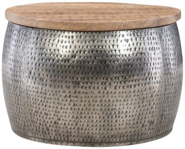 The Royce storage drum is a stylish accent featuring a hammered metal barrel in a subdued silver hue topped with a distressed mango-wood lid. Its lift-off top reveals generous hidden storage, making it both decorative and functional, ideal for modern and transitional interiors.Read More