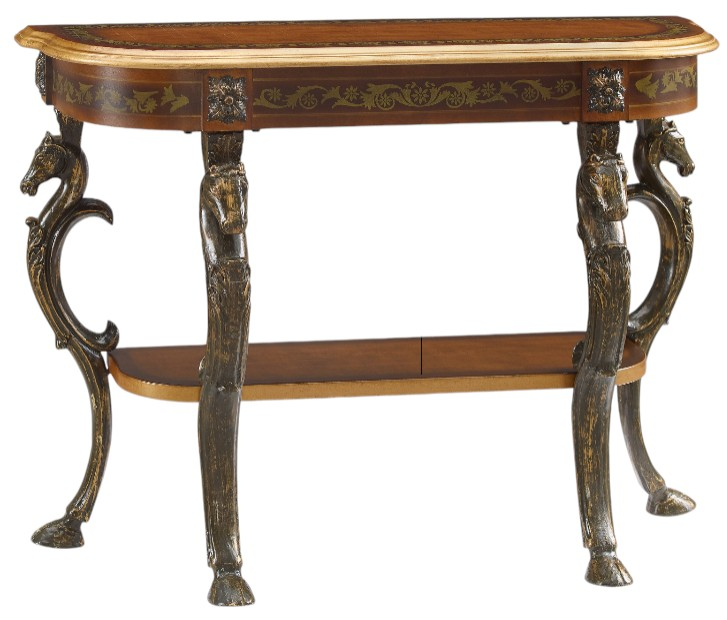 Classic Flicka console table with horse head, hoof-footed cast legs, and a generous display shelf. Floral hand-painted Motif with linen-textured top. A sophisticated piece ideal for entryways, living rooms, or bedrooms.Read More
