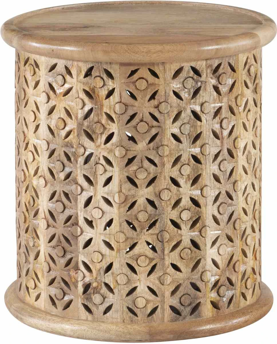 Add visual interest into your home with this hand carved wood accent table. The round silhouette offers a welcome contrast to the angular elements in a space. Use it in any room to hold a lamp, set drinks, or display your favorite photos.Read More