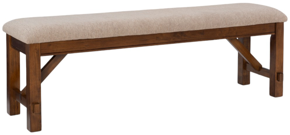 Infused with casual, rustic charm, this Dining Bench adds an inviting farmhouse touch to your kitchen or dining room. The Bench features acacia and rubberwood construction is a rich dark hazelnut finish that perfectly accentuates strong lines and crisp angles. An upholstered seat is backless and perfect for kids and adults alike.