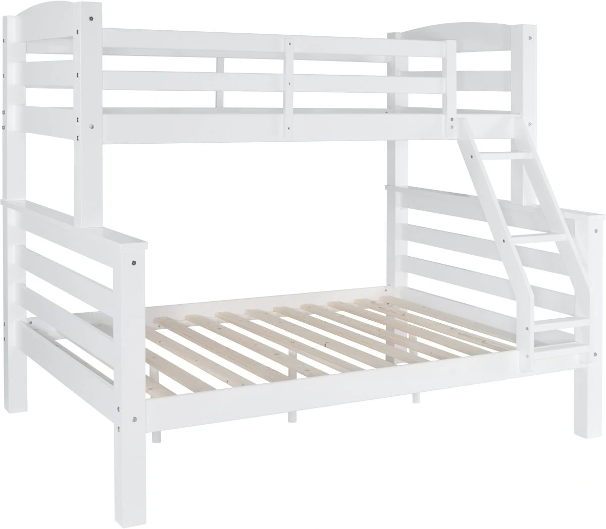 Space-saving twin/full bunk bed makes sharing rooms easy for siblings and sleepovers. Solid wood slats eliminate the need for box springs and sturdy construction. Raised arch footboard adds a stylish accent, and sleek white finish is fun to mix and match with colorful bed linens, blankets, pillows, throws, bedroom dressers, and storage bins.Read More