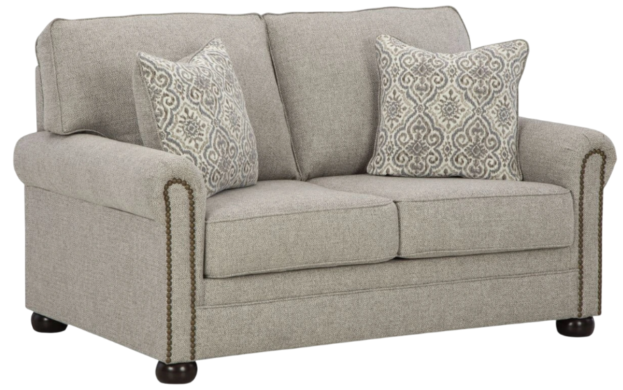 Inspired by the past but rooted firmly in the present, this loveseat complements your transitional seating area. Its versatile upholstery is delightfully detailed for a subtle herringbone effect. Designer touches like decorative nailhead trim and bun legs add traditional character. With this loveseat's reliable style and comfort, all you need to do is sit back and relax.Read More