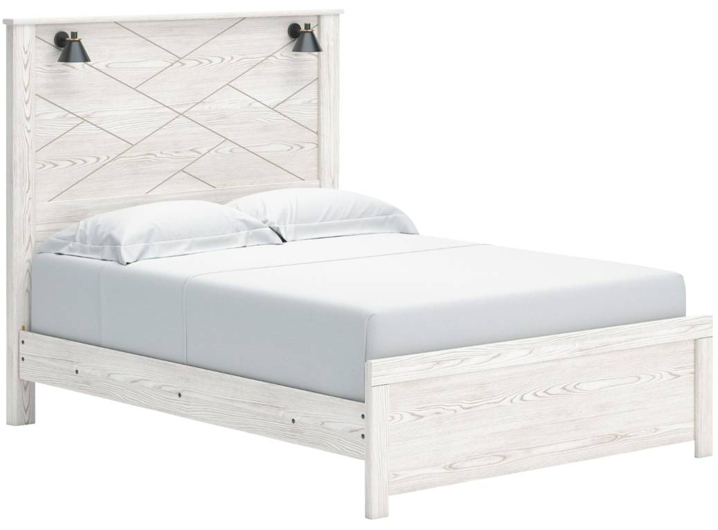 Cool, clean and casually modern. This queen panel bed’s white rustic finish sets the tone for your calming sanctuary. Matte black sconce lights and an abstract design on the headboard bring a fresh look to the bed’s simply stunning profile.Read More