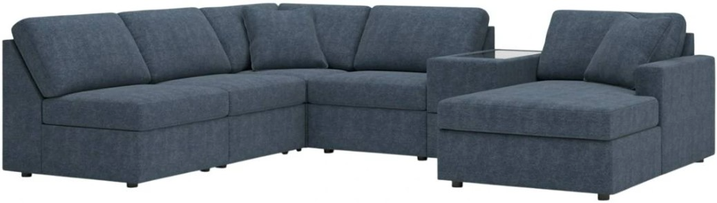 Includes 6 Modular Pieces: Right-arm facing corner chaise, 3 armless chairs, wedge and console with storage