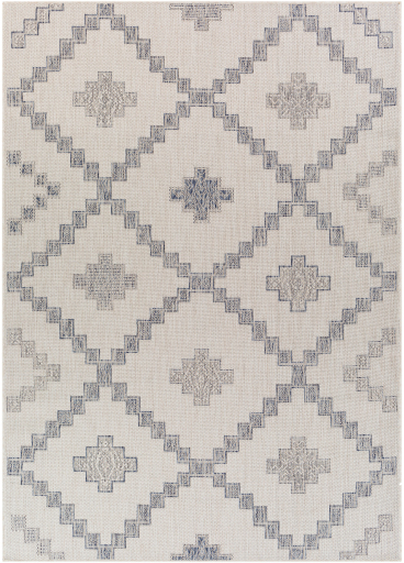 Surya Tuareg Off-White, Navy, Blue, Pale Blue colored 5'3" x 7' Rug features 100% polypropylene, is outdoor safe, machine woven and no pile.Read More